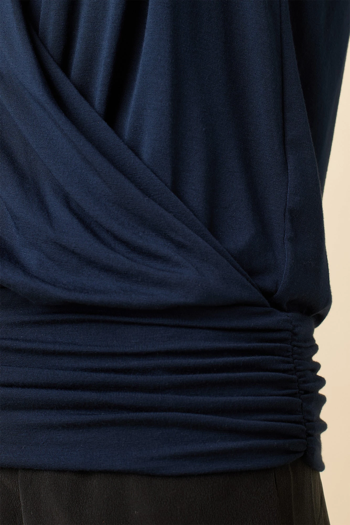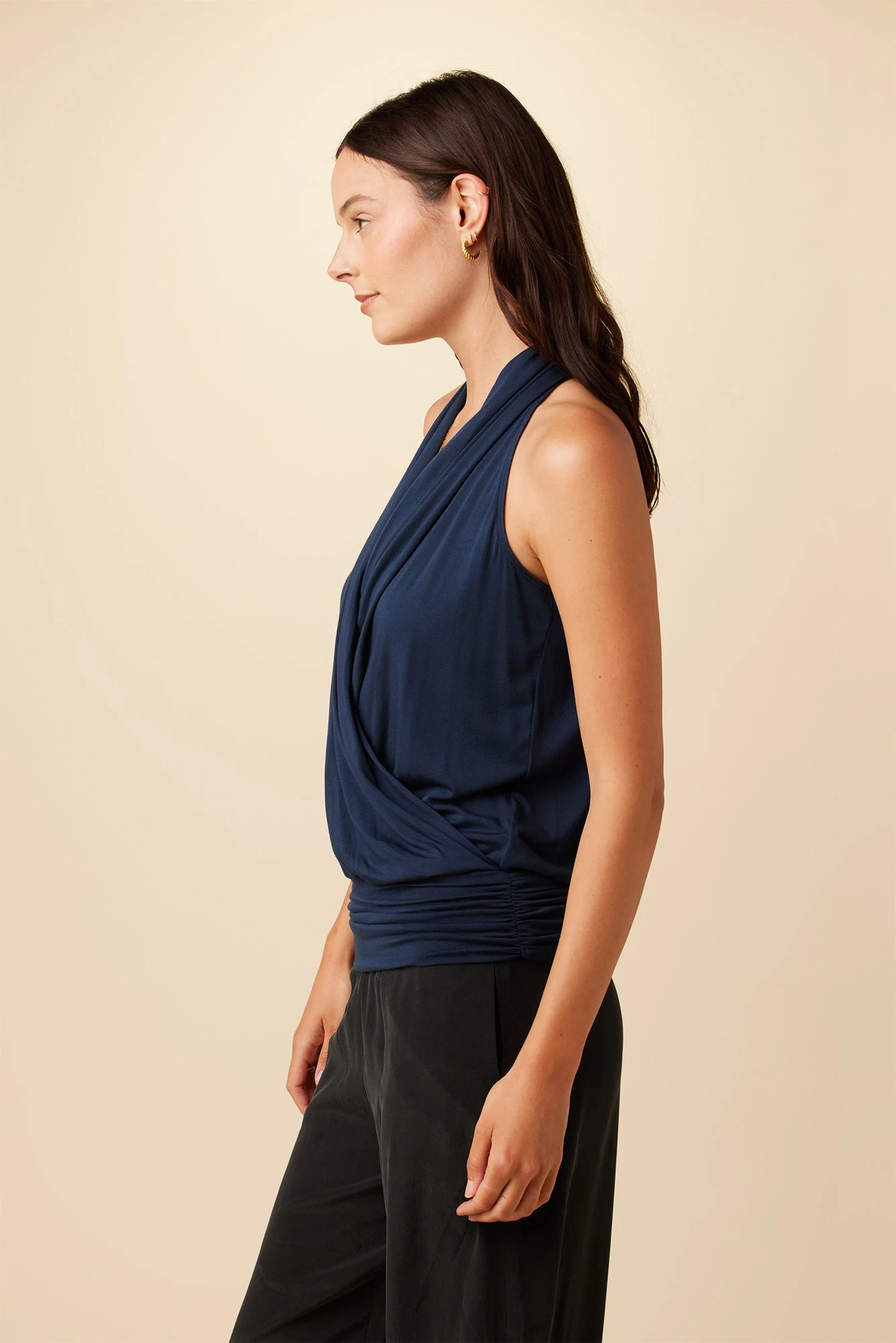 - Surplice wrap halter tank with a keyhole opening in back and a thick bottom band with shirring detail at the sides.