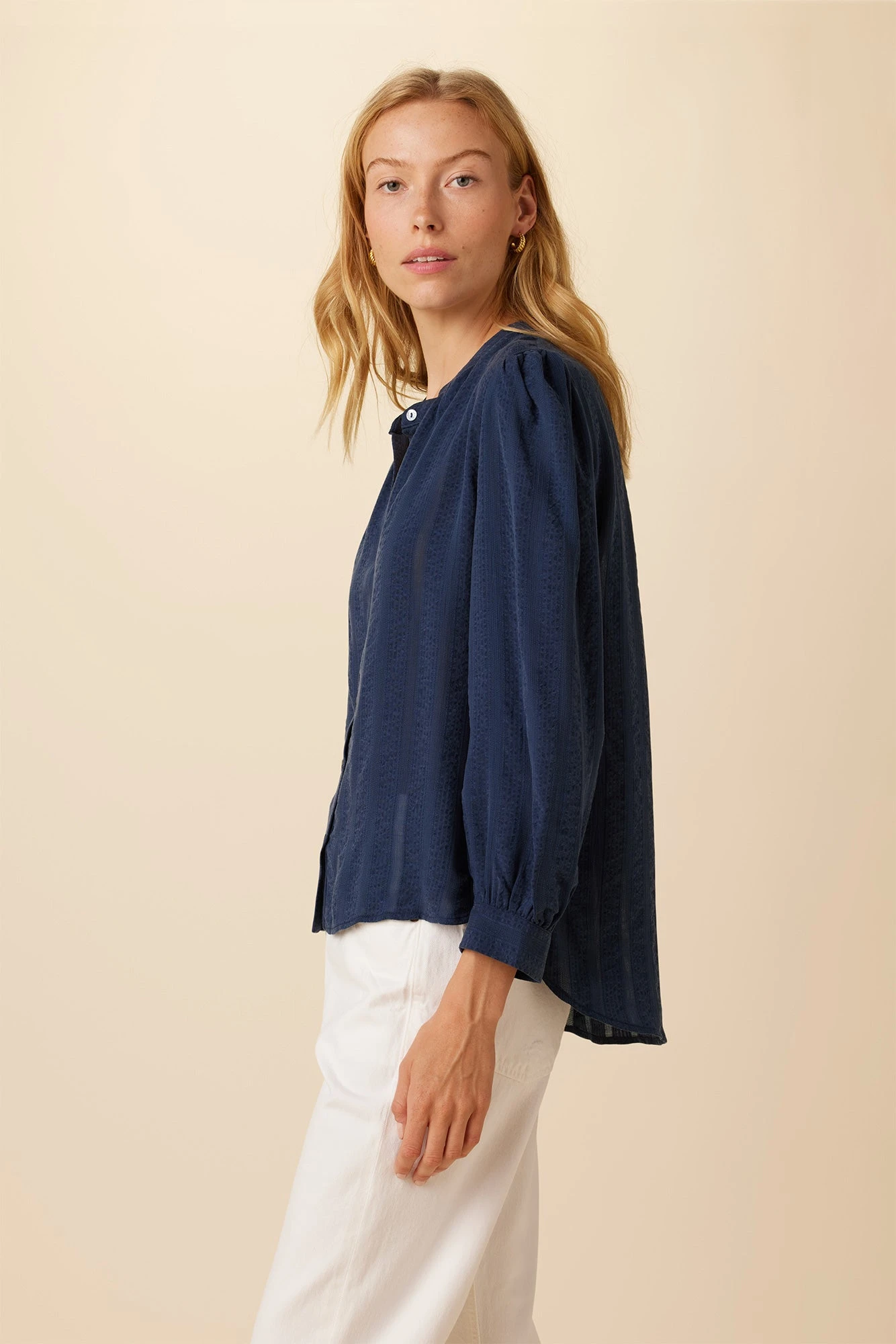 Long sleeve, relaxed fit blouse with functional front button, made from TENCEL™, a fabric derived from eucalyptus trees that is softer than silk and cooler than linen. We suggest pairing with your favorite mid or high-rise bottoms.