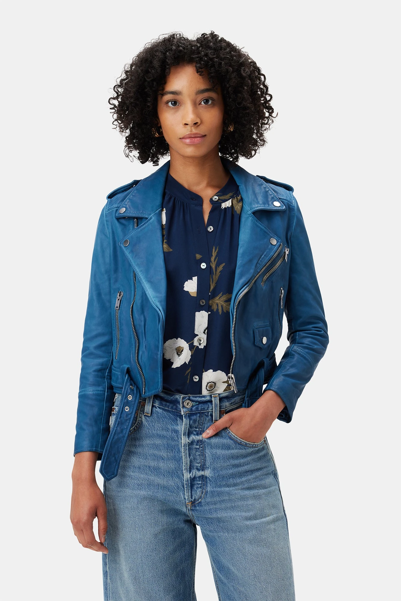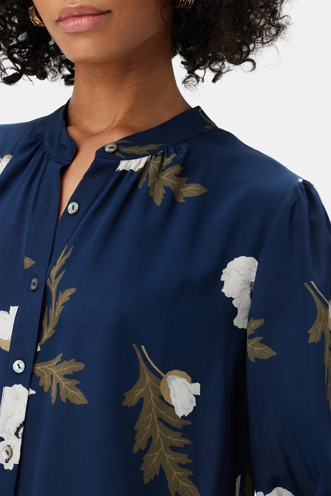 - Featuring full button front placket, slight puff sleeves and sheering at the neckline