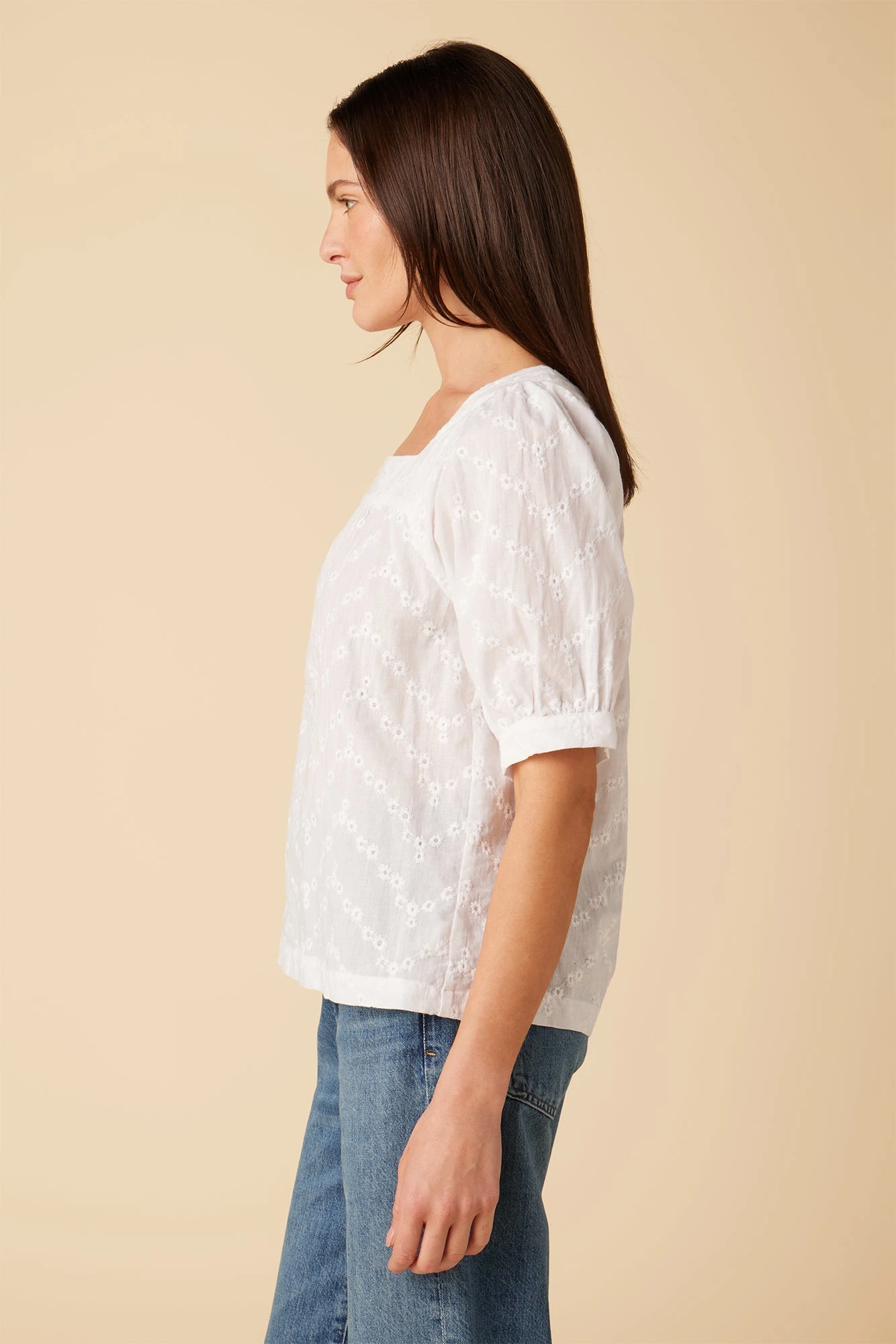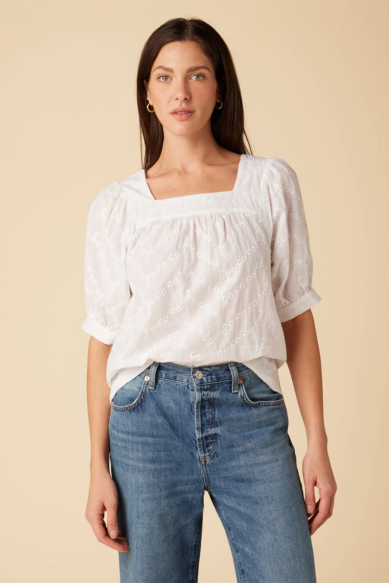 Square-neck blouse with short puff sleeves and a relaxed silhouette that can be worn tucked in or loose.