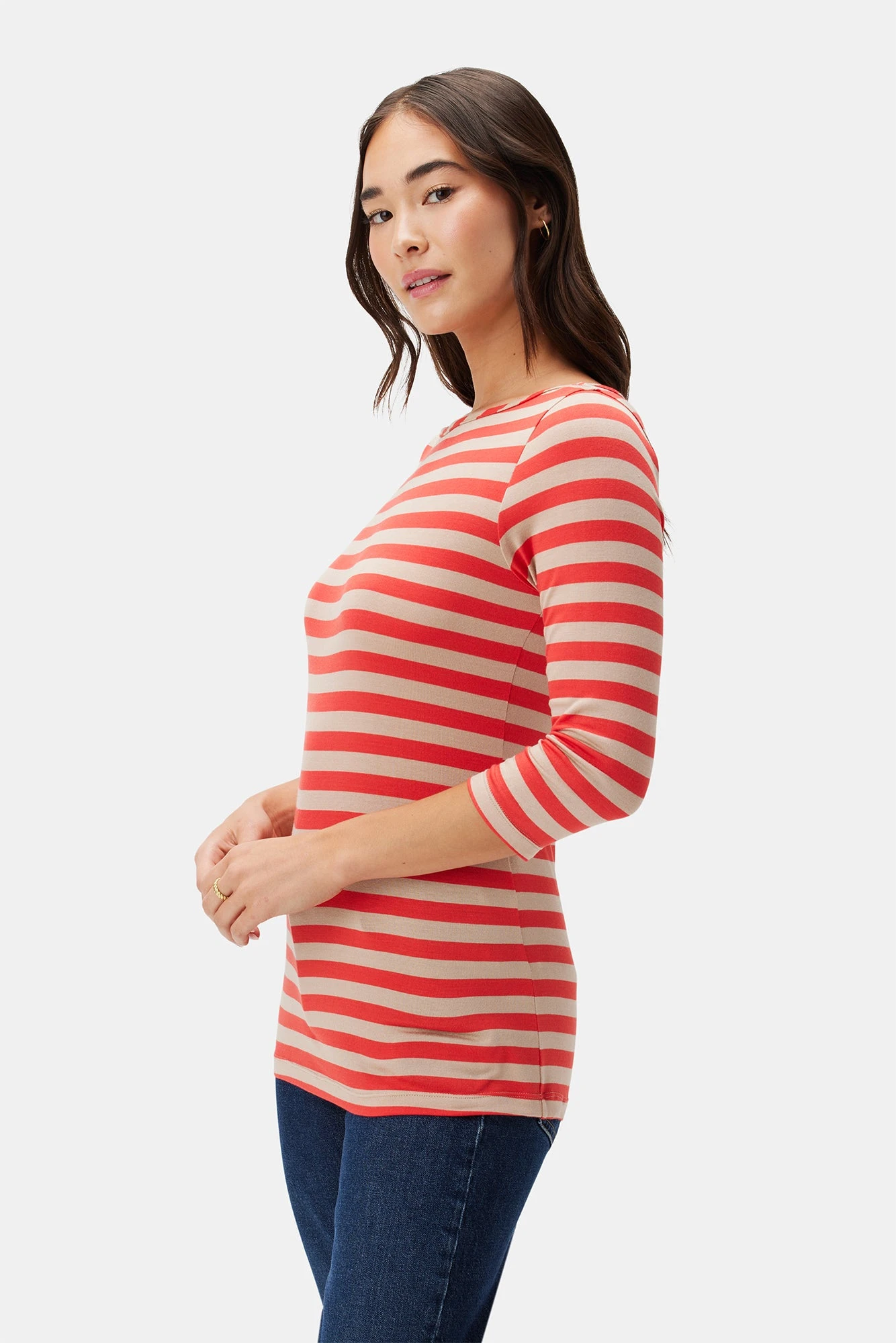 - 3/4 sleeve tee with a classic boat neckline and easy silhouette.