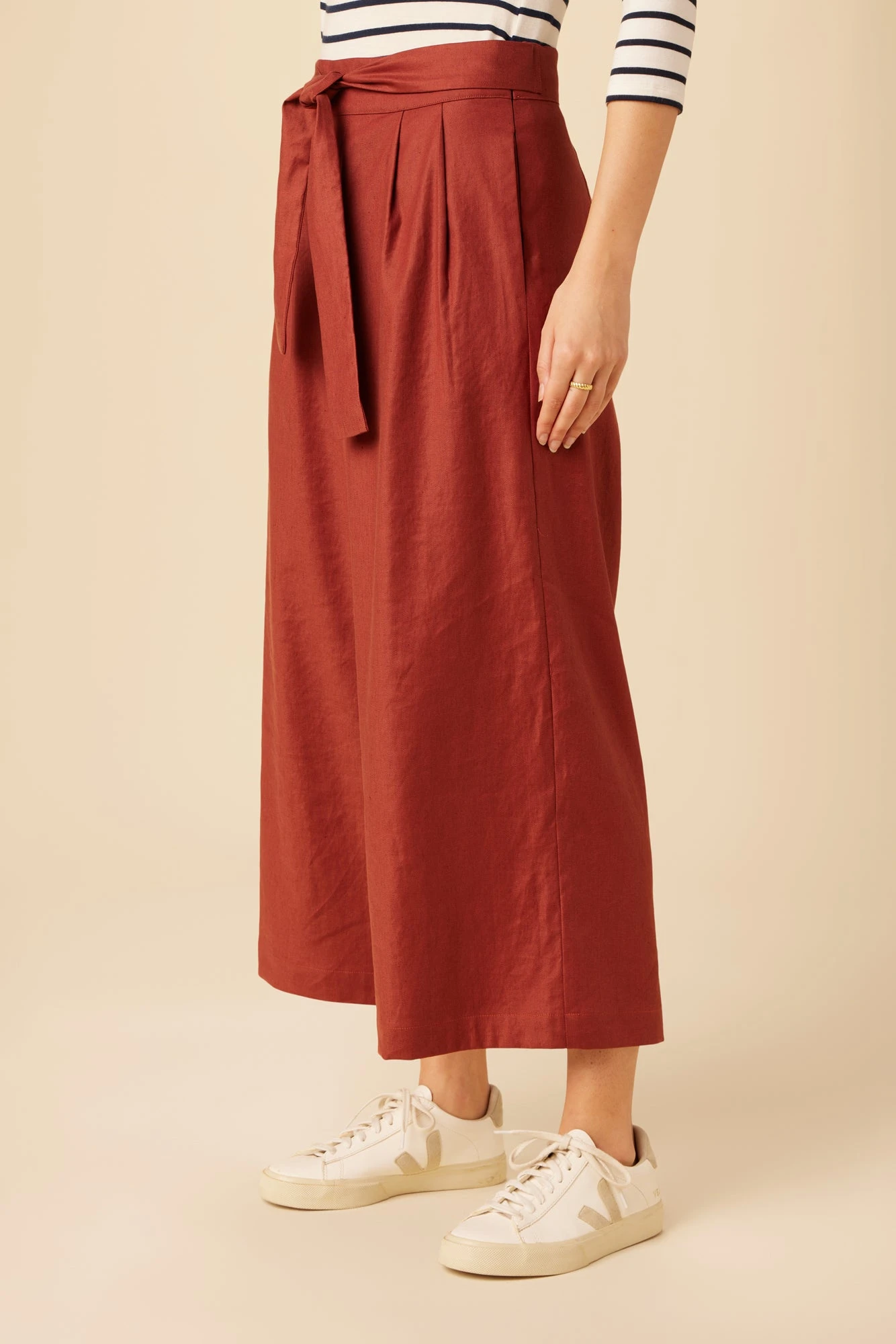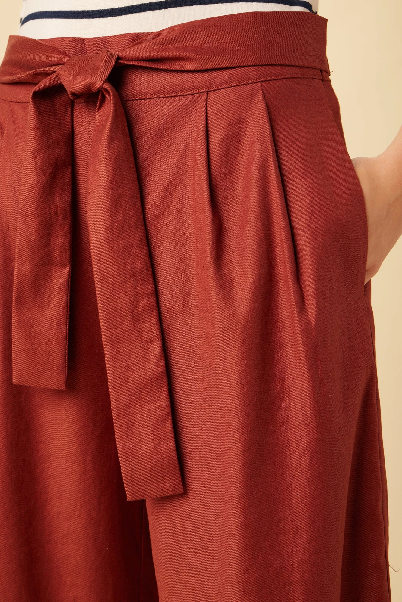 High waisted cropped trousers with pleat front, a side zipper, waist tie, and a wide-leg silhouette. Made in our Femme Fête fabric, a luxe blend of Tencel, Organic Cotton, and Linen.