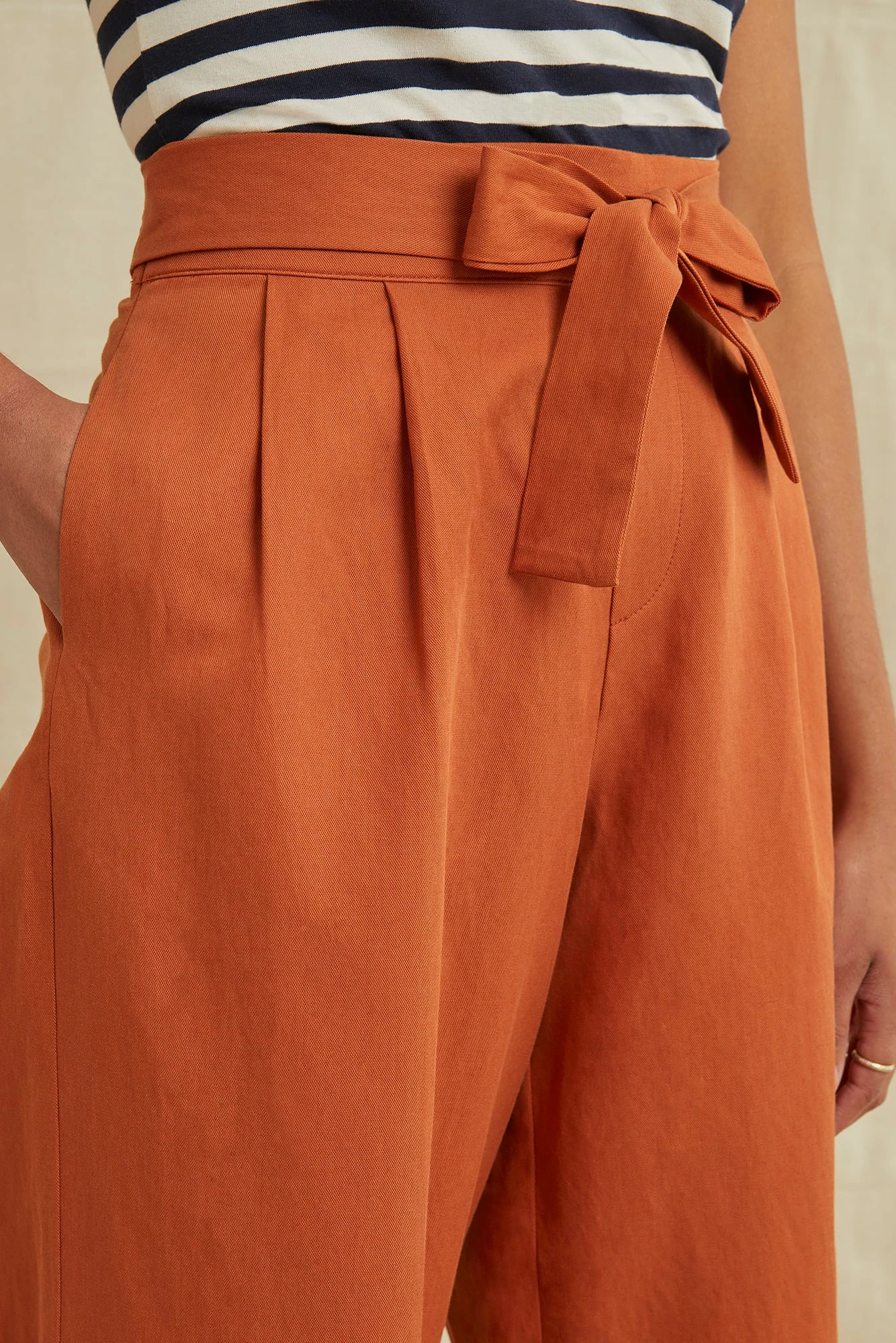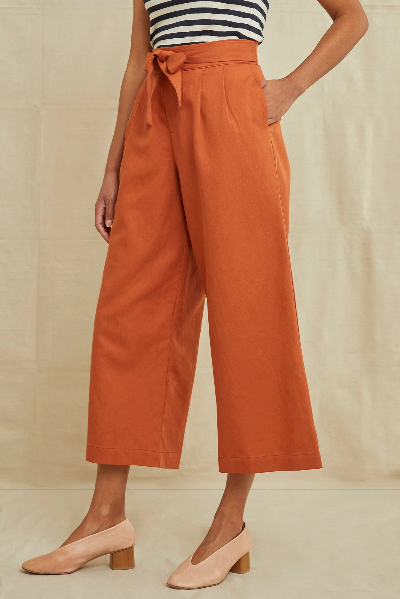 High waisted cropped trousers with a side zipper, waist tie, and a wide-leg silhouette. Made in our Femme Fête fabric, a luxe blend of Tencel, Organic Cotton, and Linen.