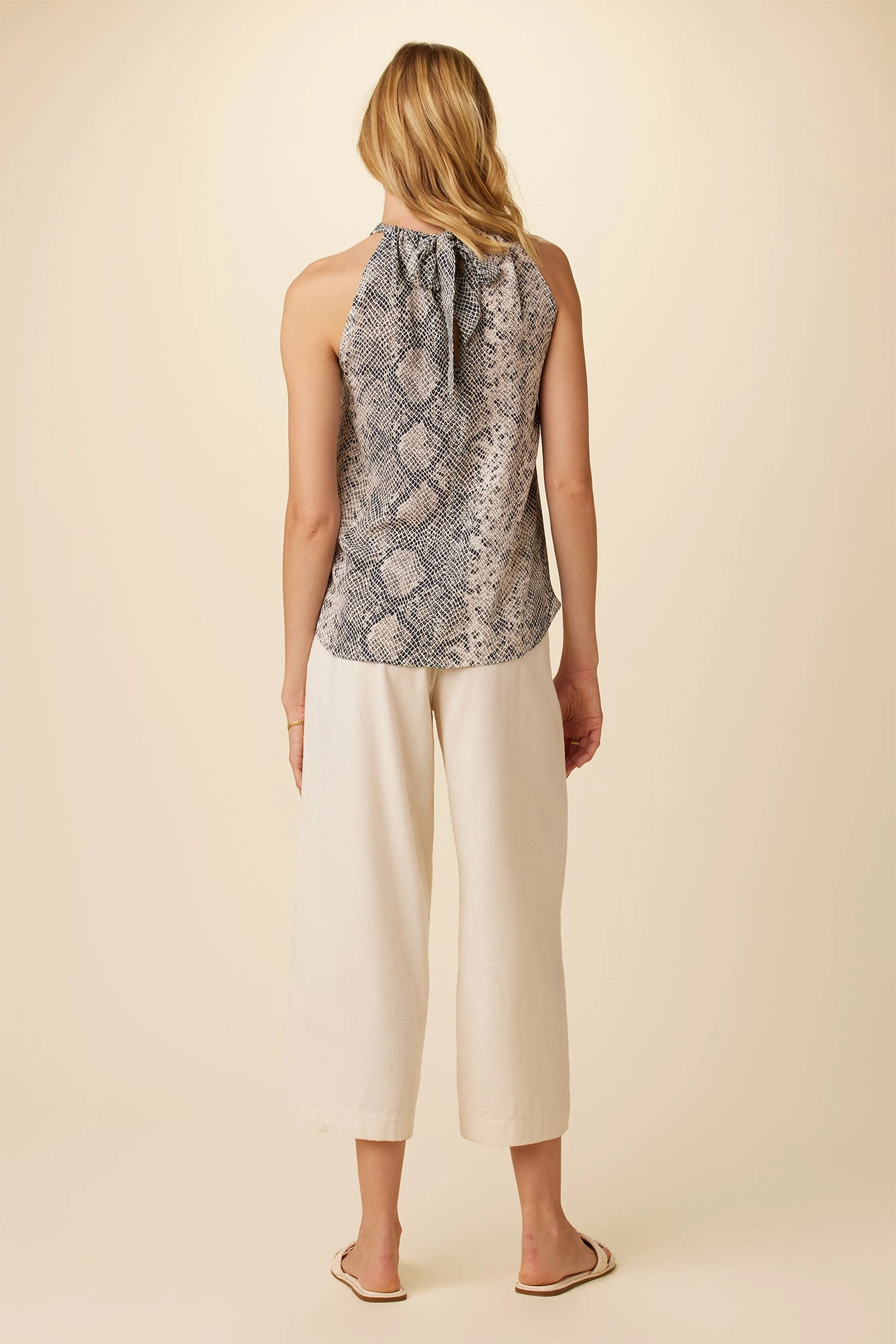 Relaxed fit, halter neck blouse with tie through keyhole, made in our luxurious Washable Silk. This top pairs well with any rise bottoms, tucked in or over top.