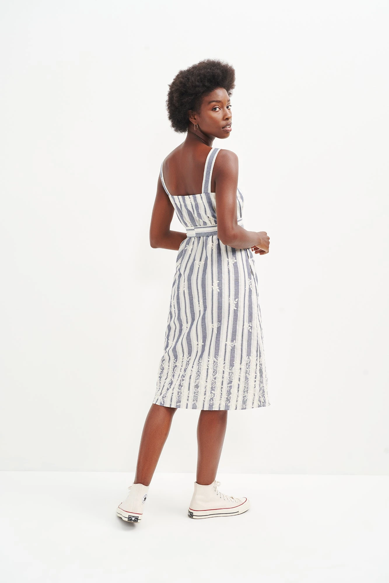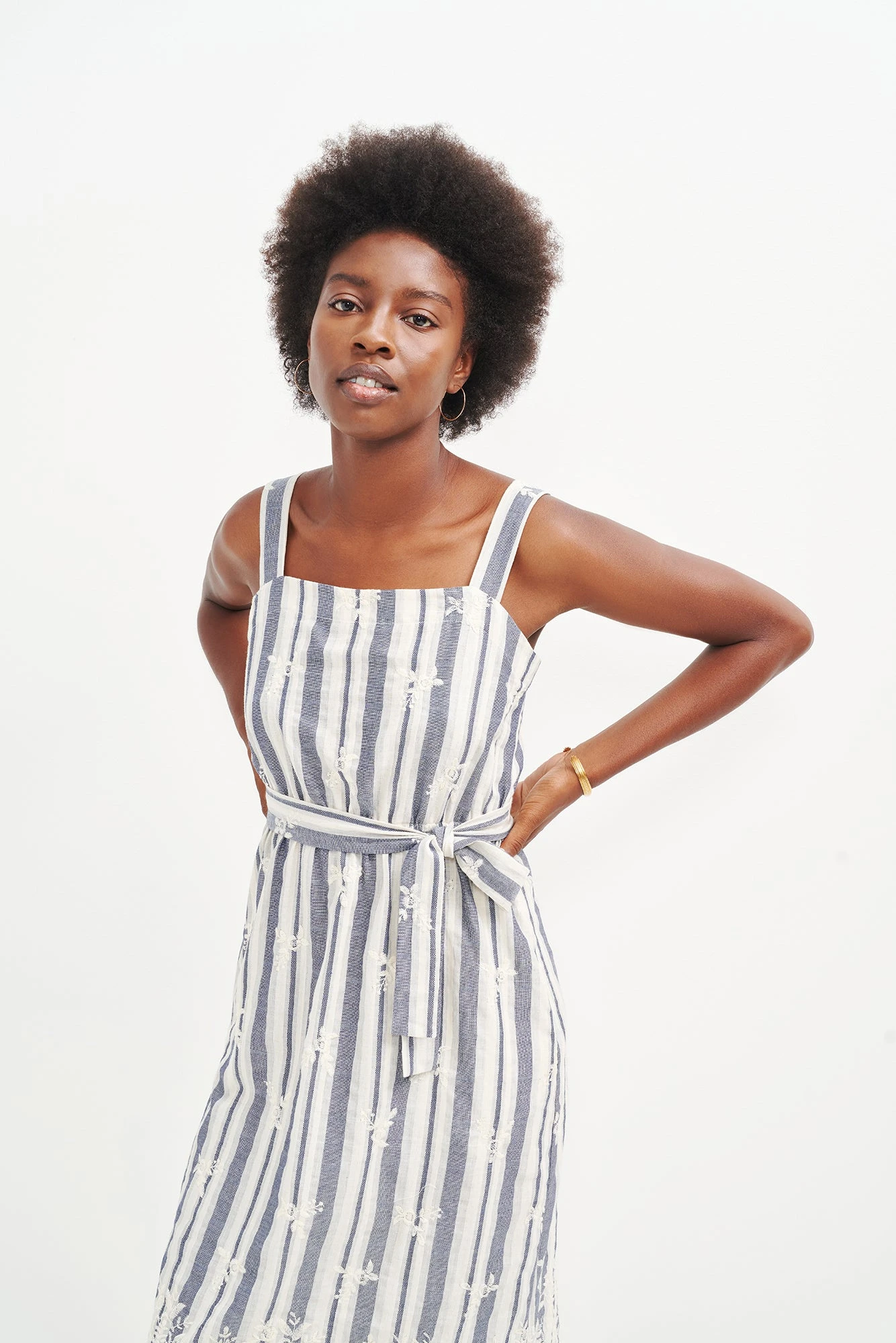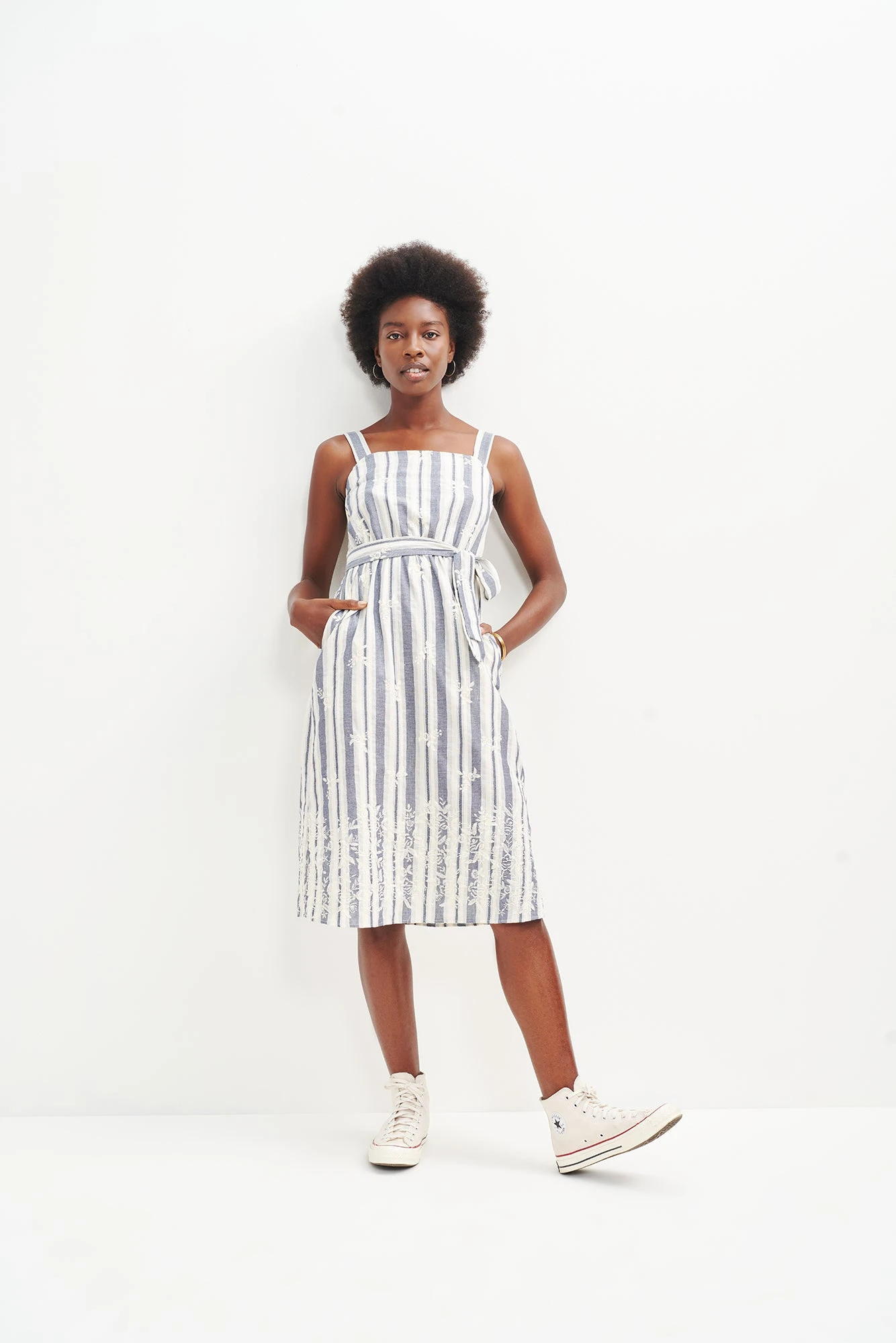 Made from upcycled organic cotton, this sleeveless, square neck dress features lace overlaid on stripes and has the perfect amount of lightweight structure.
