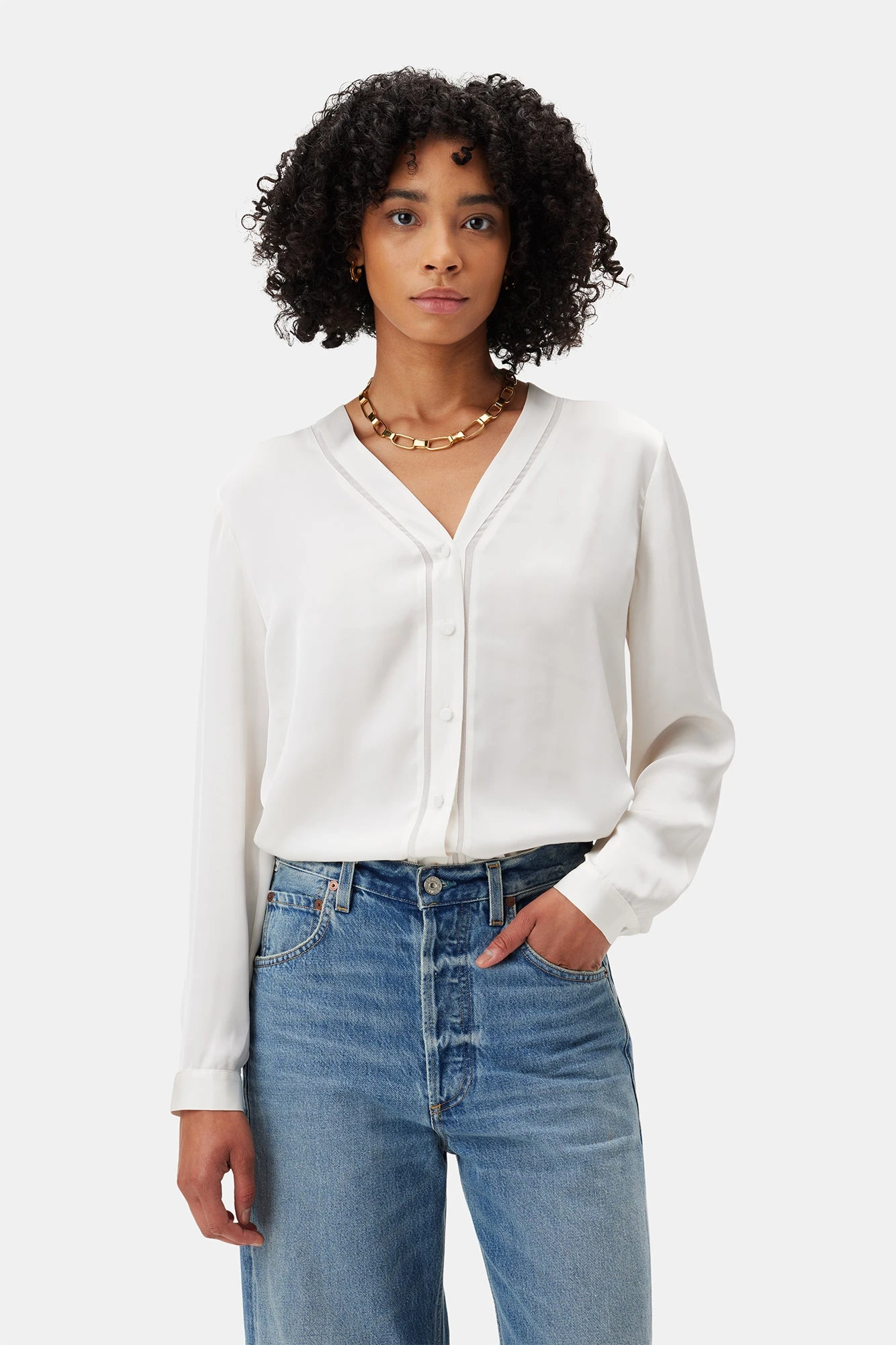 - One of our best selling styles, this long sleeve, slim fit v-neck blouse features front placket buttons and cuffed sleeves.