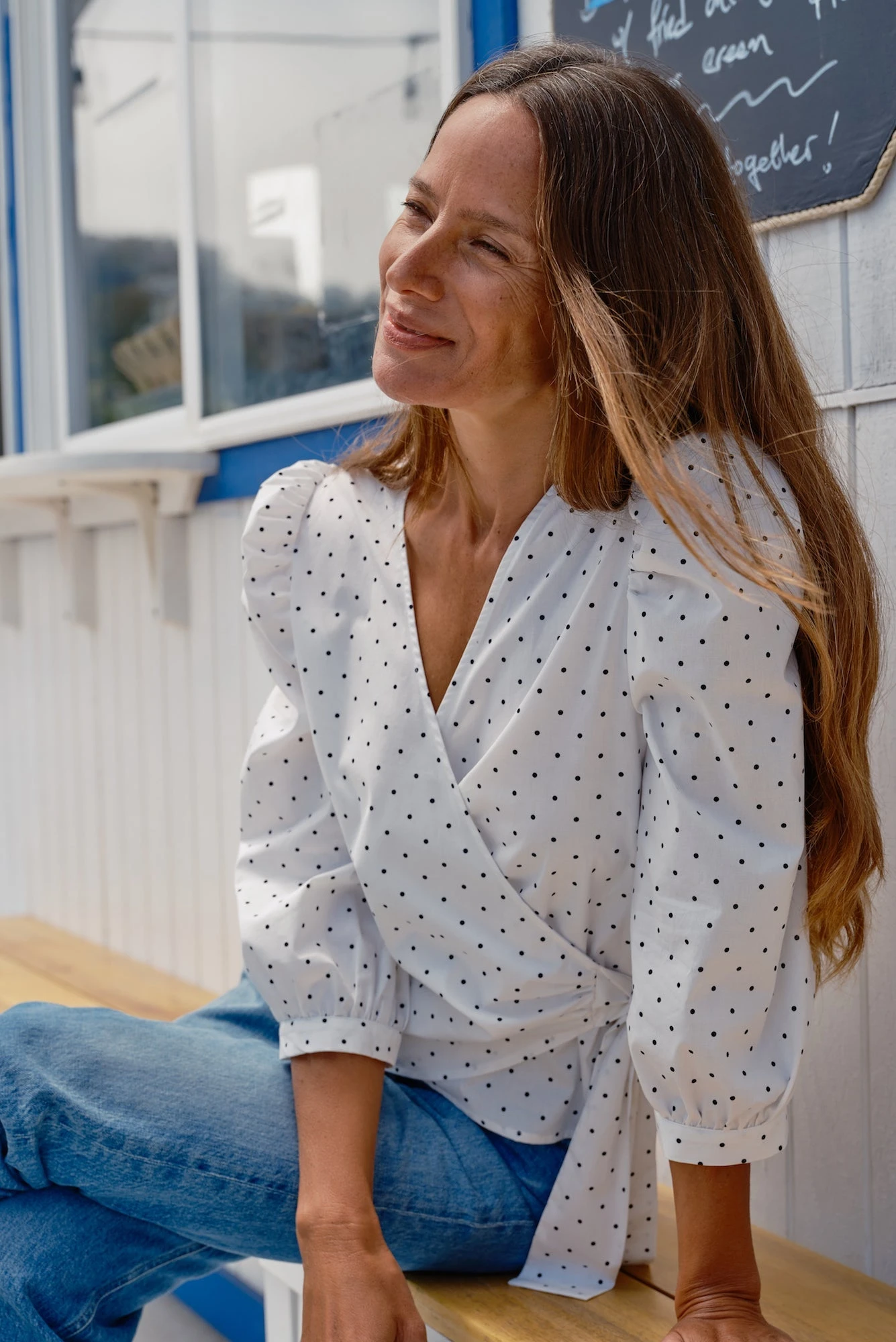 Made from upcycled and repurposed cotton, this lightweight wrap-style blouse is ready to wear with flowy pants, midi skirts, and your fave denim.