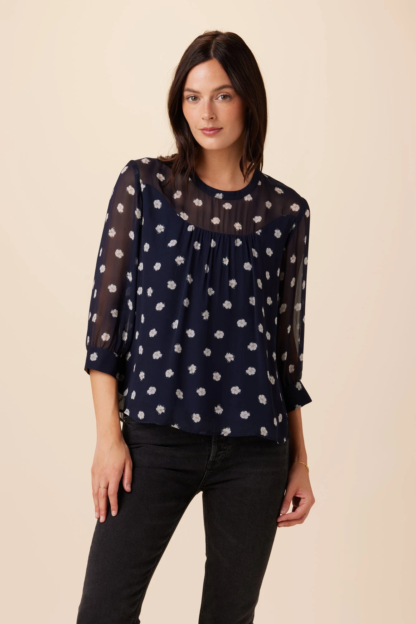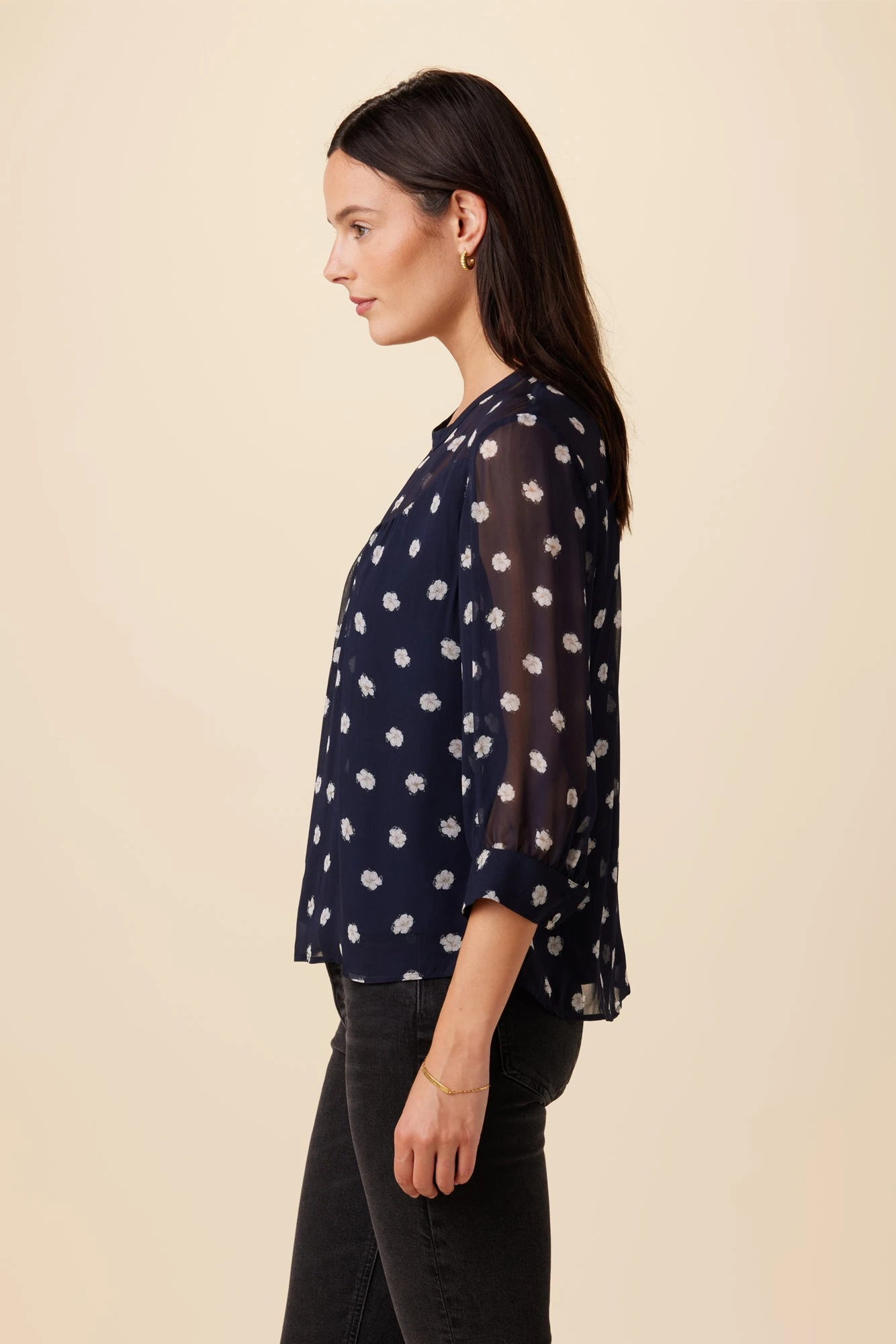 Relaxed fit, 3/4 sleeve blouse made from our Viscose Chiffon fabric, with a built in lining from neck down and sheer neckline and sleeves, and a button detail.