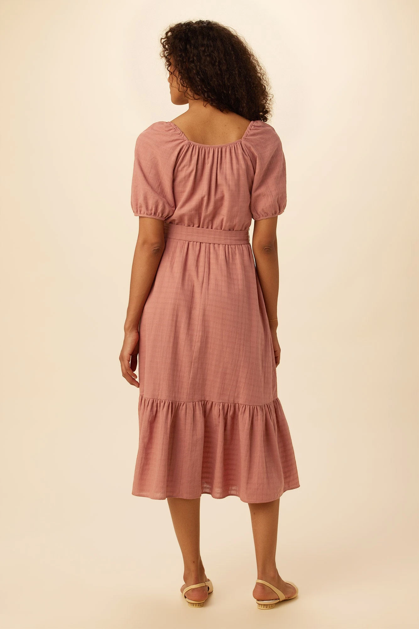 Short sleeve midi dress with a square neckline, ruffle hem and tie waist detail, made from 100% Organic Cotton.