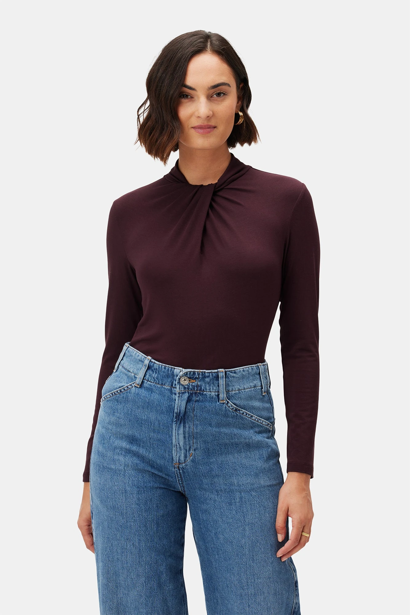 - Long sleeve, slim fit top featuring mock neck twist detail and center front slit, with loop and button closure at back neck.